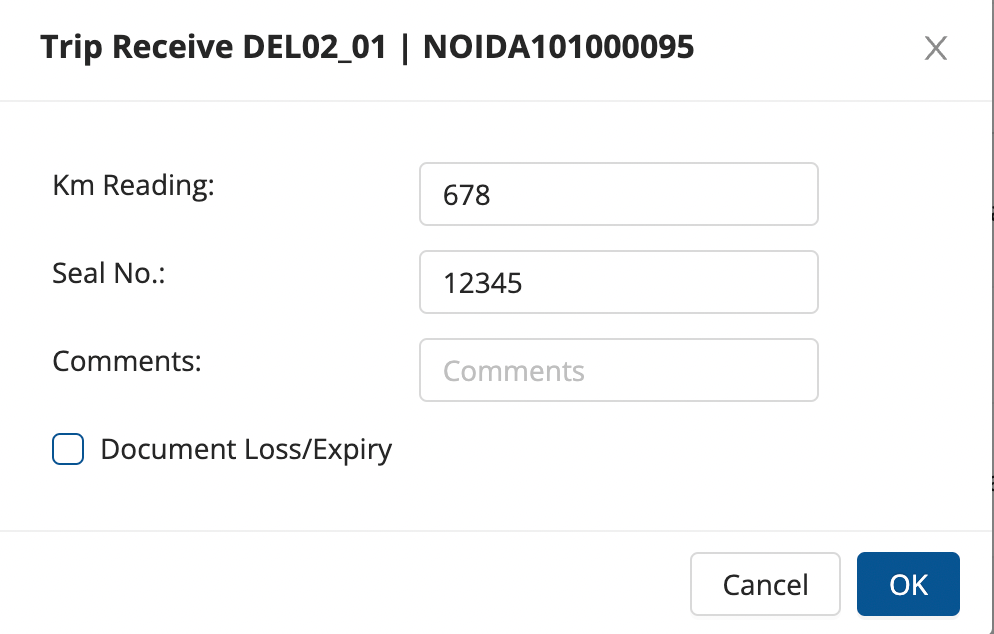 - Enter Seal No. (provided at the time of trip departure)and KM Reading and click on OK to receive the trip successfully.