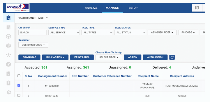 These CNs where undelivered is marked, the rider needs to return these to the destination hub. The next day a Manifest is generated again and they will be made available for delivery.