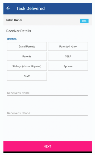 If the rider chooses to deliver the CN, the DELIVERED option should be chosen in the above screen.The rider also needs to mark the receiver details i.e choose one of the options from the Relations available.