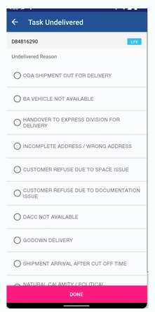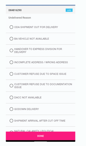 The riders will choose this option when they are unable to deliver the consignment due to various reasons shown in the undelivered reason screen.