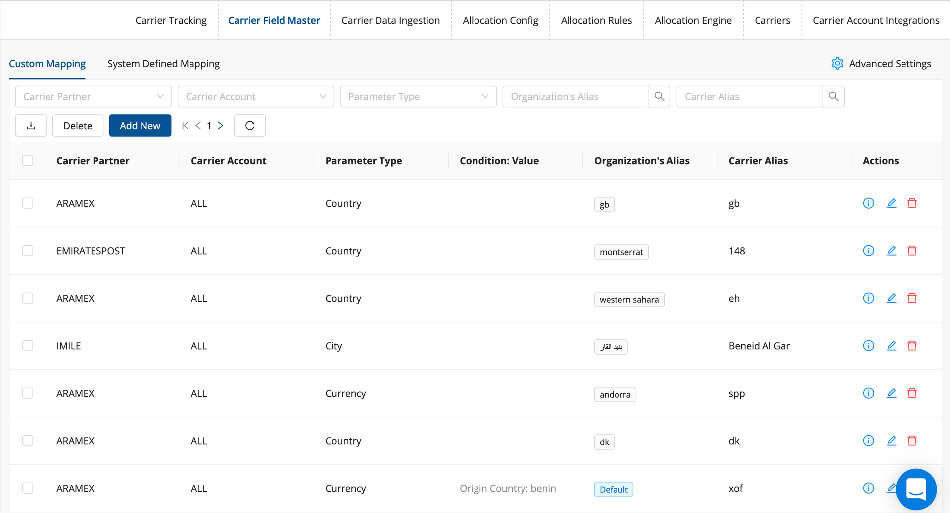 Commonly used mappings for the carriers are defined here (Standard City, Country, etc. names to Carrier Alias for the same)