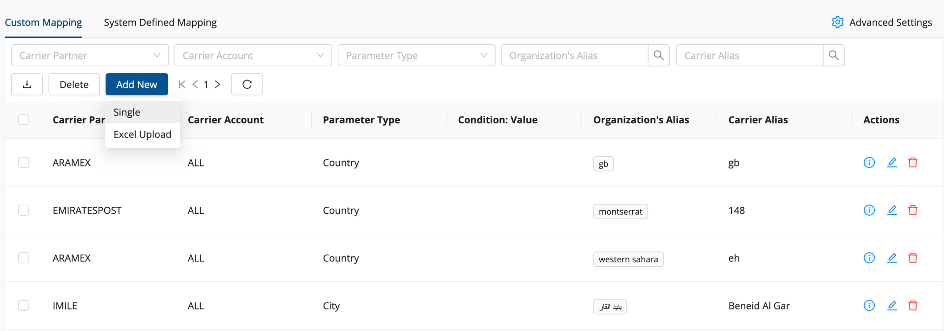 - Select Add New and then Single Mapping. One can also use Excel upload to add multiple mappings using a CSV file