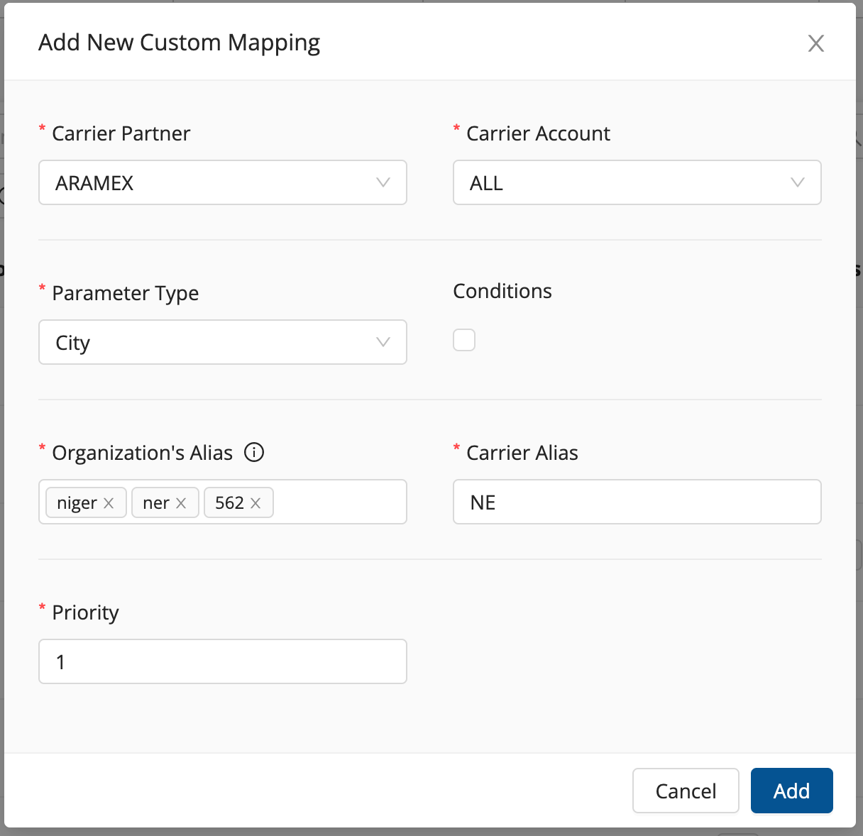 Addition of a rule in CFM that maps Organization’s Alias "niger", "ner", and "562" to Carrier Alias "NE" for Parameter Type "city"