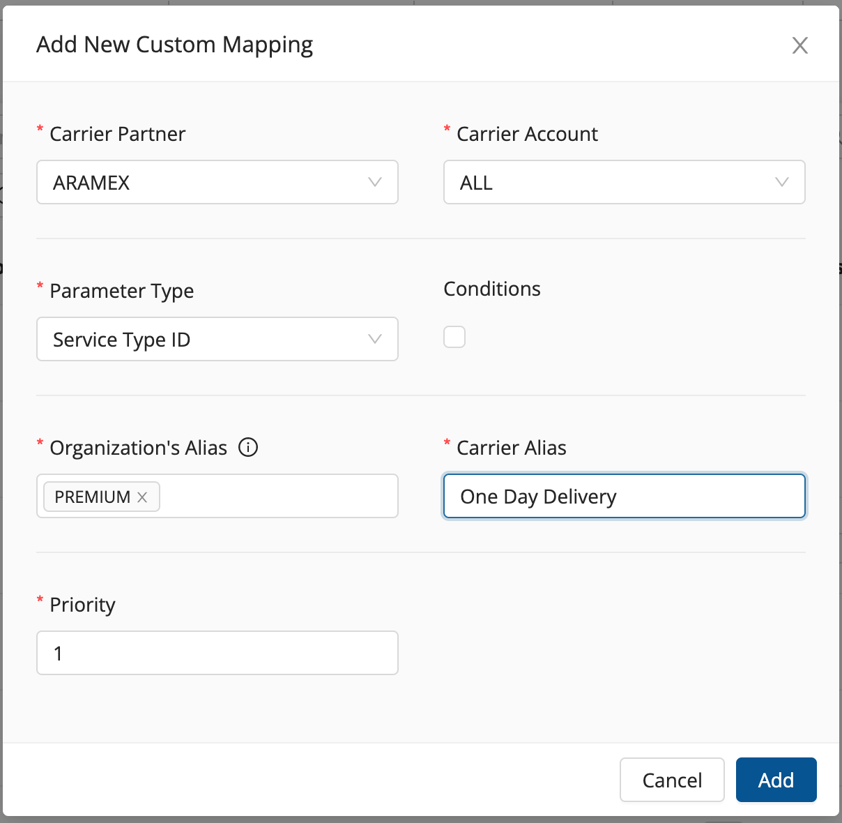 Addition of a rule in CFM that maps Organization’s Alias "Premium" to Carrier Alias "One Day Delivery" for Parameter Type "Service Type ID"