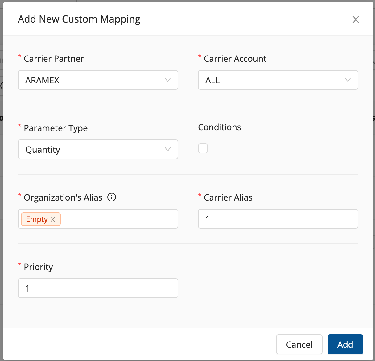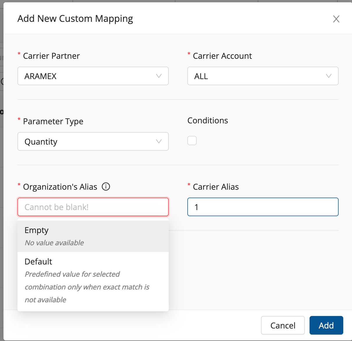 Addition of a rule in CFM that maps Organization’s Alias wild card "empty" to the Carrier Alias default value "1" for Parameter Type "quantity"