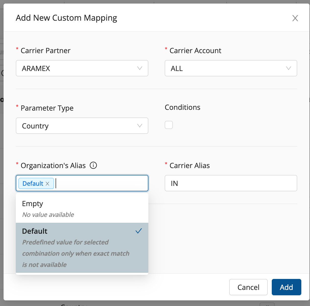 - Under “Organization’s Alias” add the values expected from the soft data/customer input or select a wild card value (“Default”, “Empty”). You can add multiple values here.