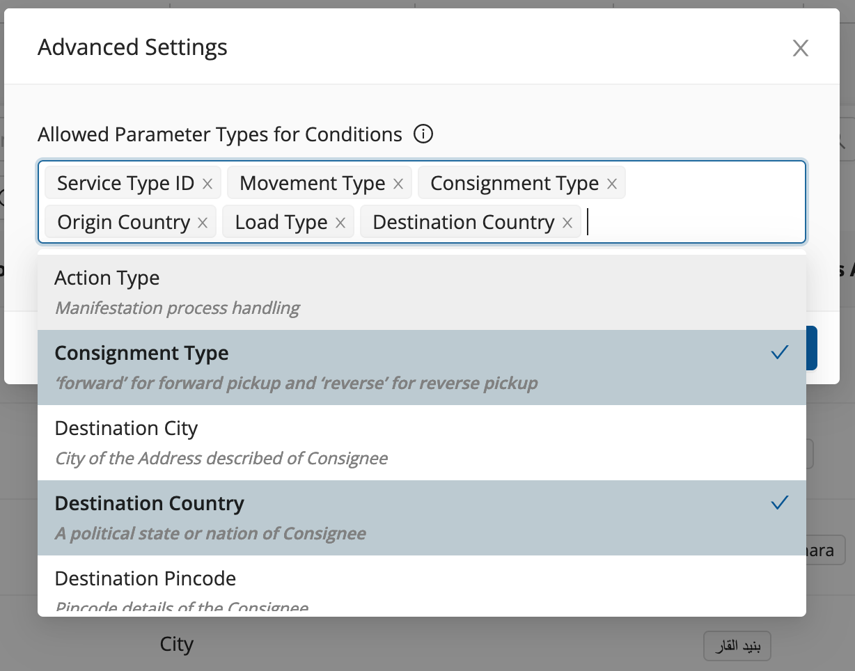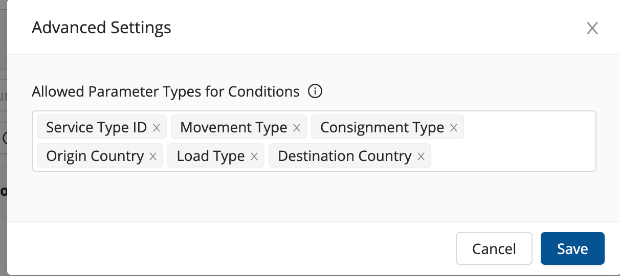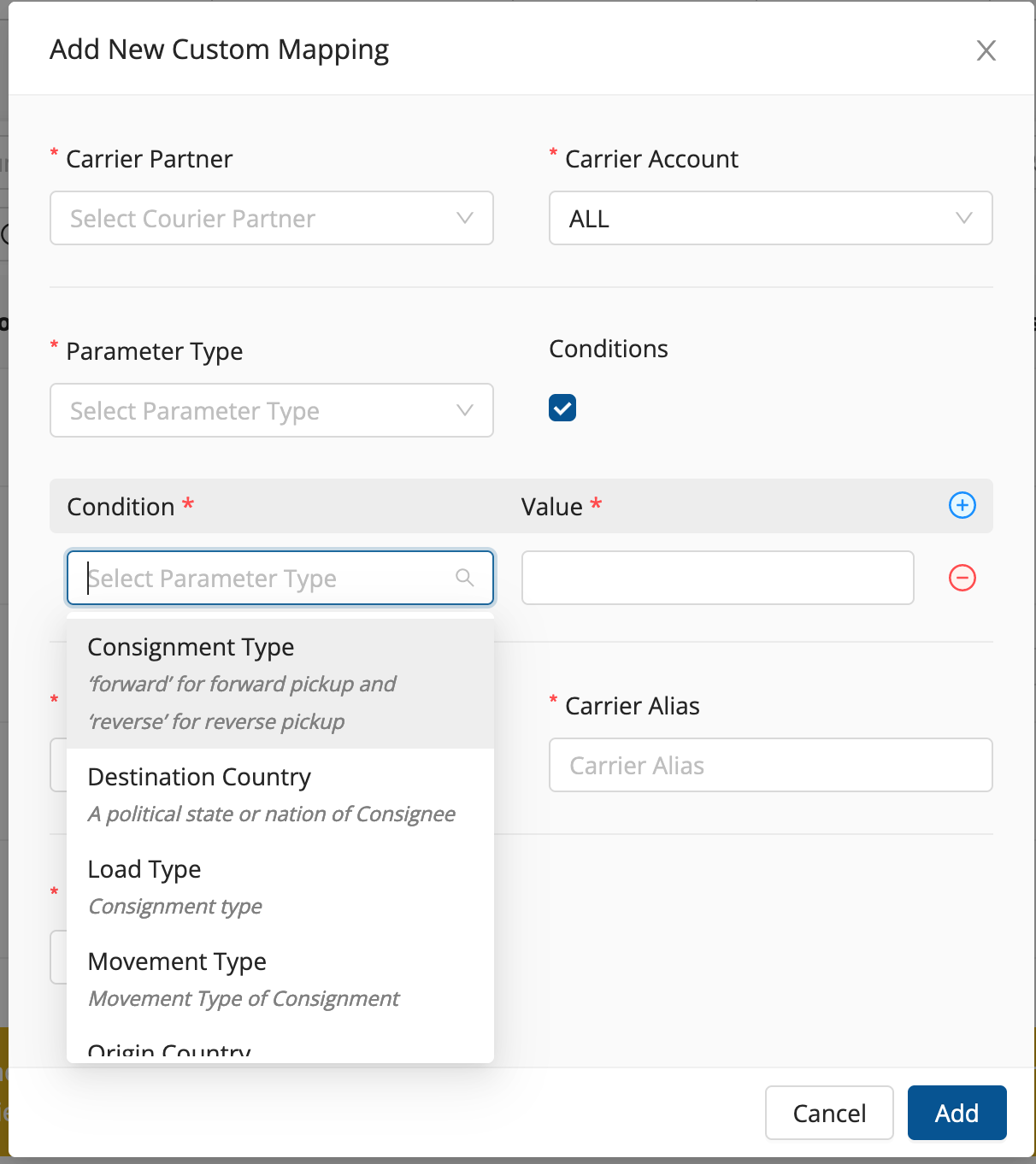 - Select the Parameter relevant to the filter from the dropdown. This dropdown only contains the enabled conditions. And type in the values in which case this condition will be valid.