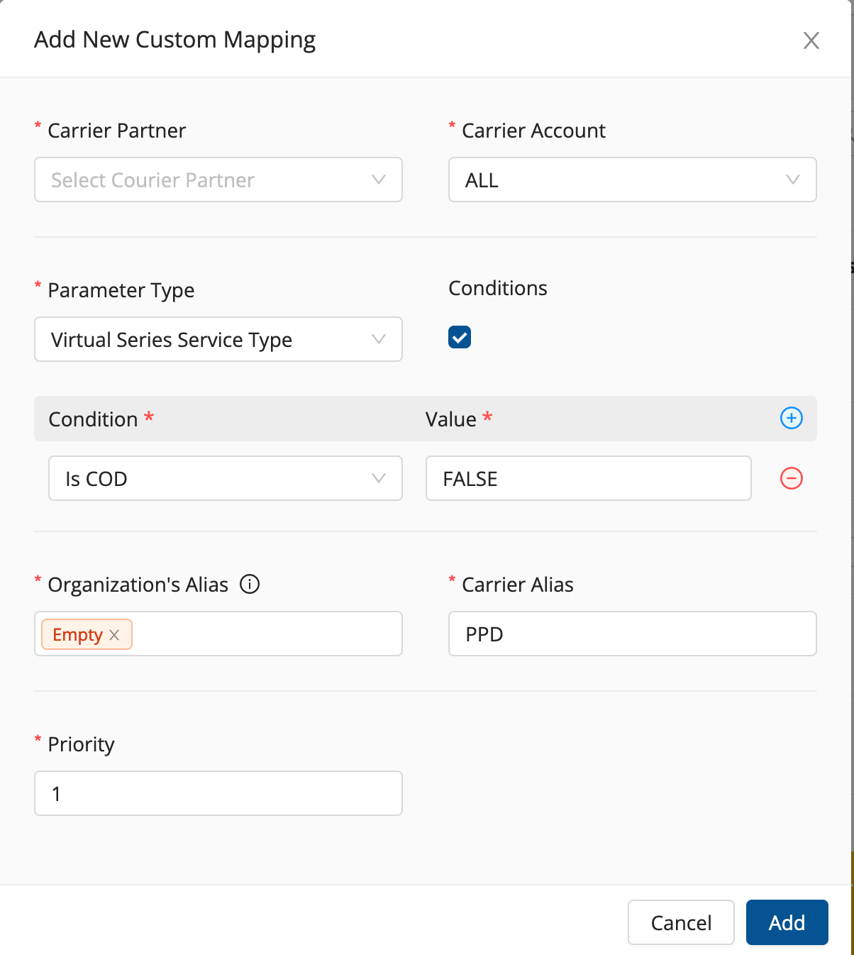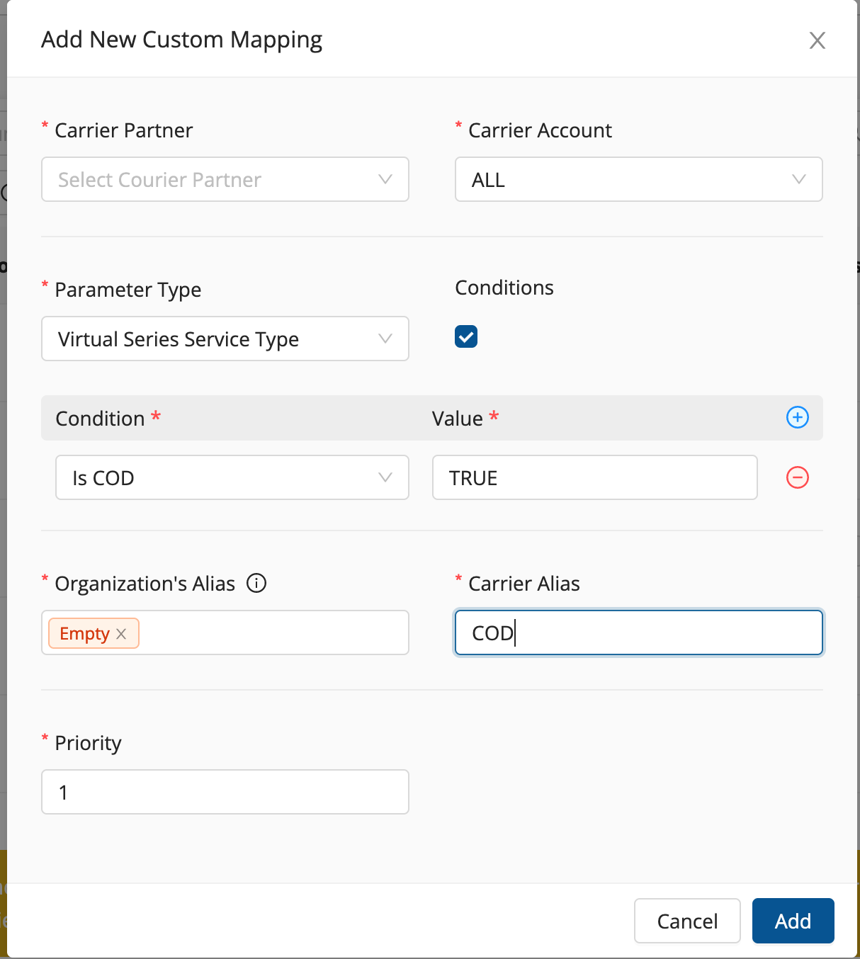 "empty"to Carrier Alias"COD"for Parameter Type"Virtual Series Service Type"given, conditionIs CODisTRUE