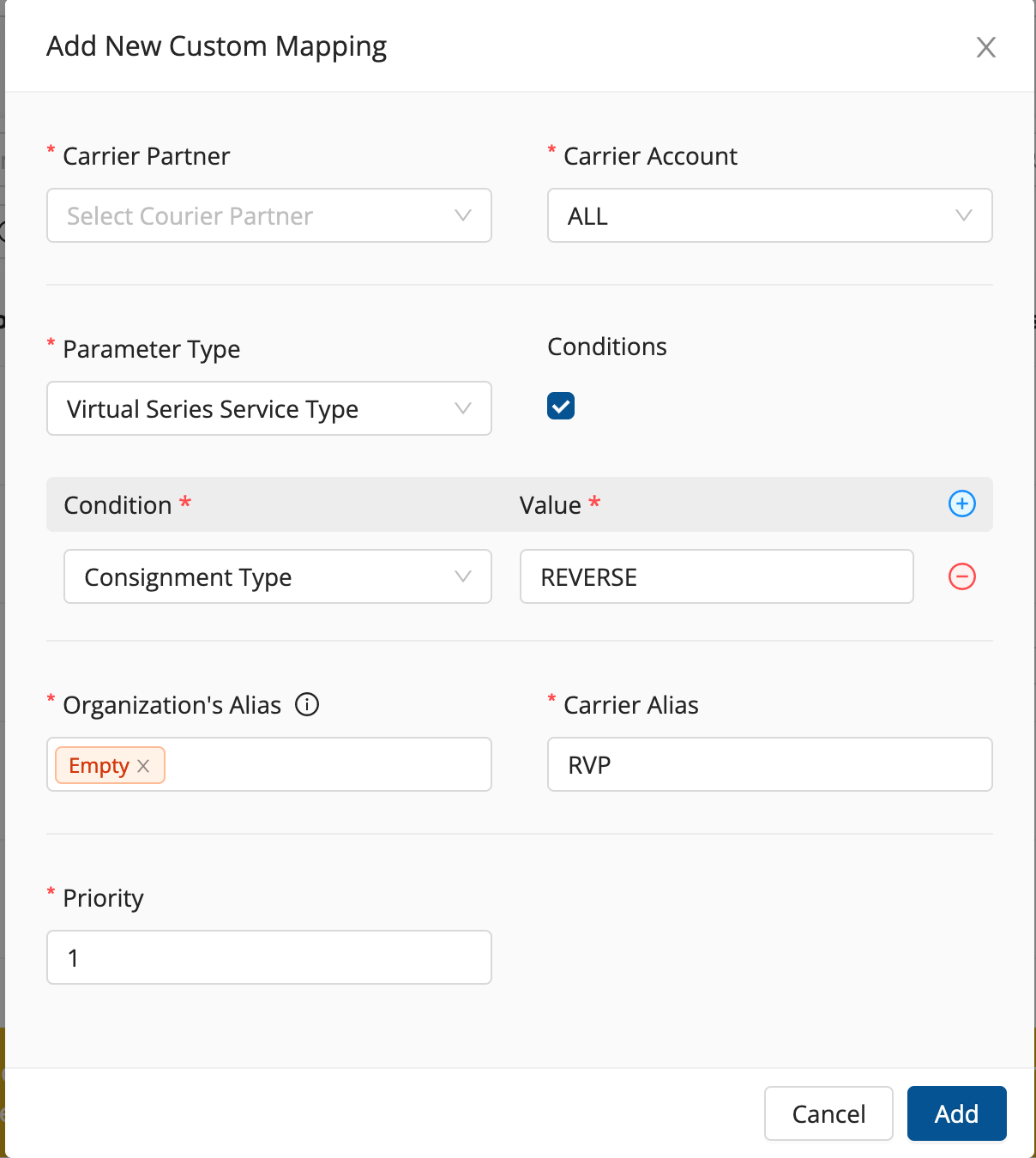 "empty"to Carrier Alias"REV"for Parameter Type"Virtual Series Service Type"given, conditionConsignment TypeisReverse
