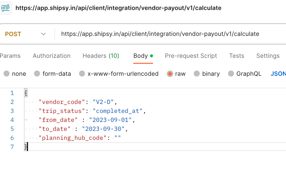 Once we are done generating the Vendor Payout Id, we need to hit the other Api below, which is used to calculate the Payout for the particular trip id generated using the First Api above
