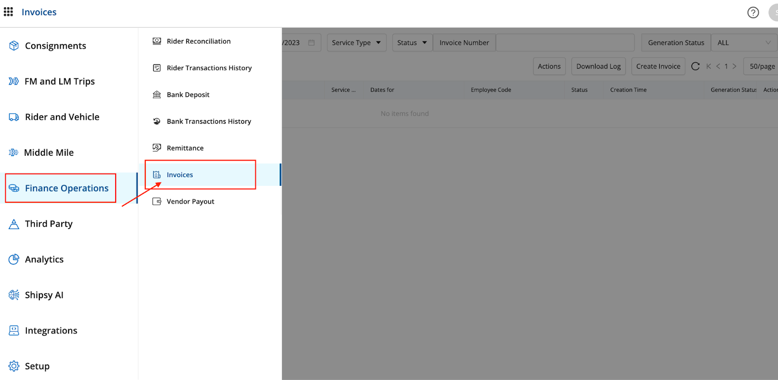 - Navigate to Shipsy Portal Menu > Click on Finance Operations > Invoices