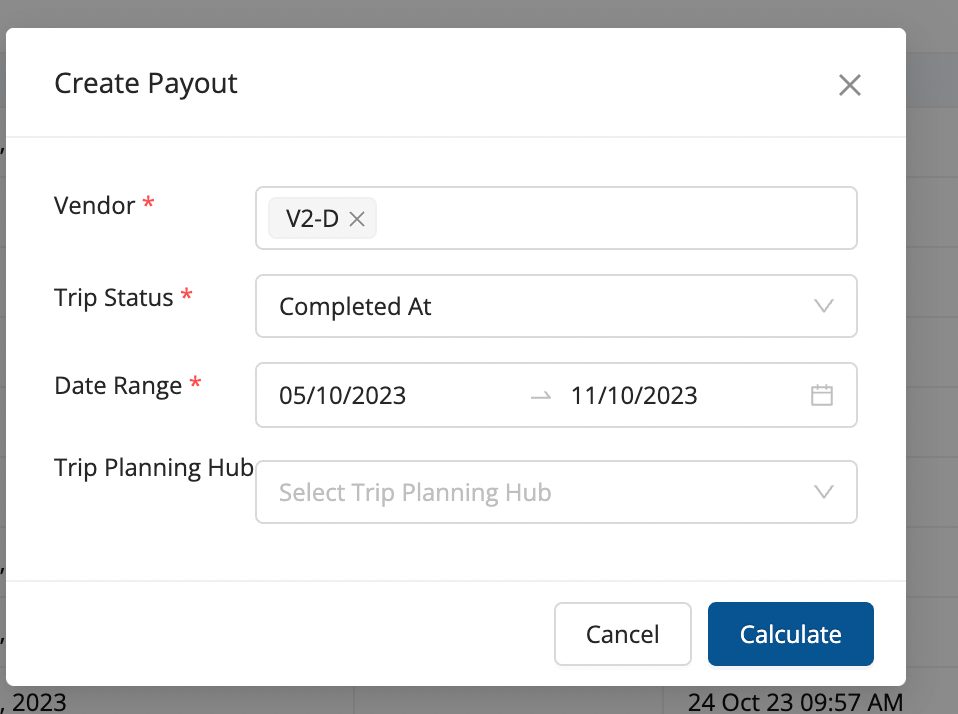 A pop-up box will open up asking to fill in details for which client would like to calculate the Vendor Payout, we need to make sure that we do not miss on the mandatory one’s marked with *. Additionally we can also fill in the Trip Planning Hub for which we would like to calculate the payout for.