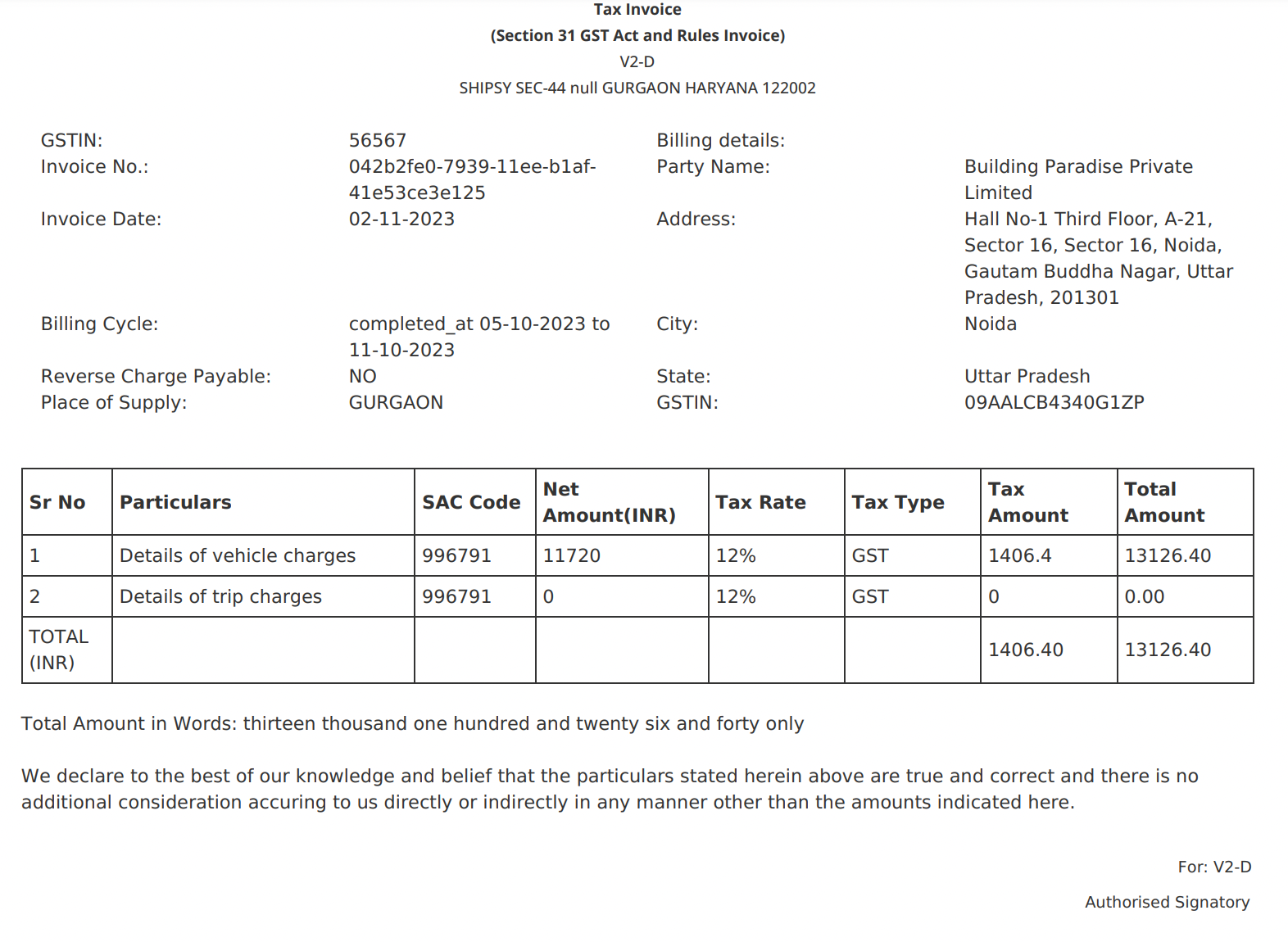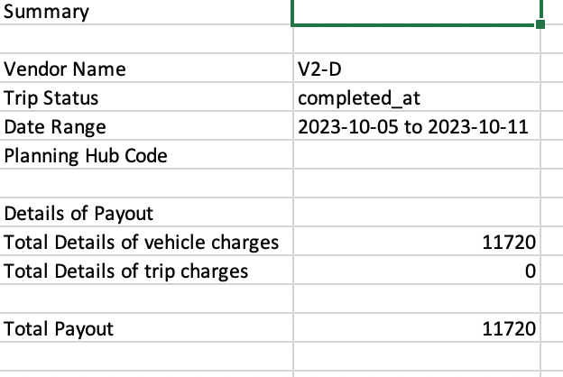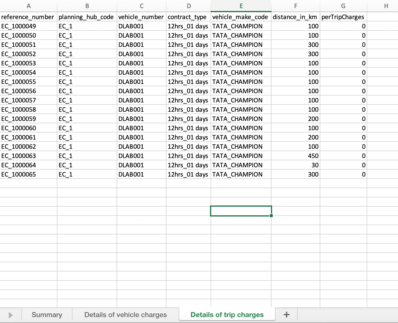 Excel format will contain, 3 Sheets: Summary, Details of Vehicle Charges and Details of Trip Charges