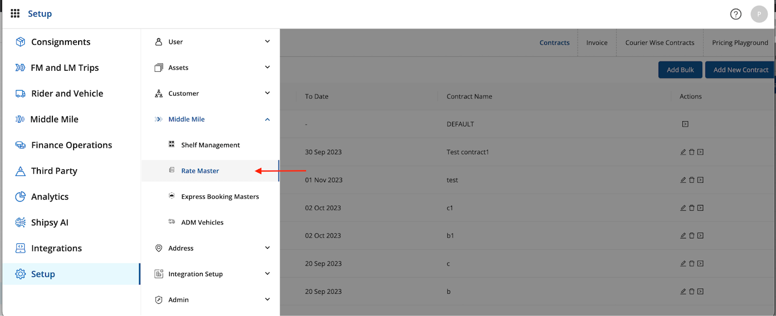 - Navigated to Shipsy portal > Setup section > Rate Masters.