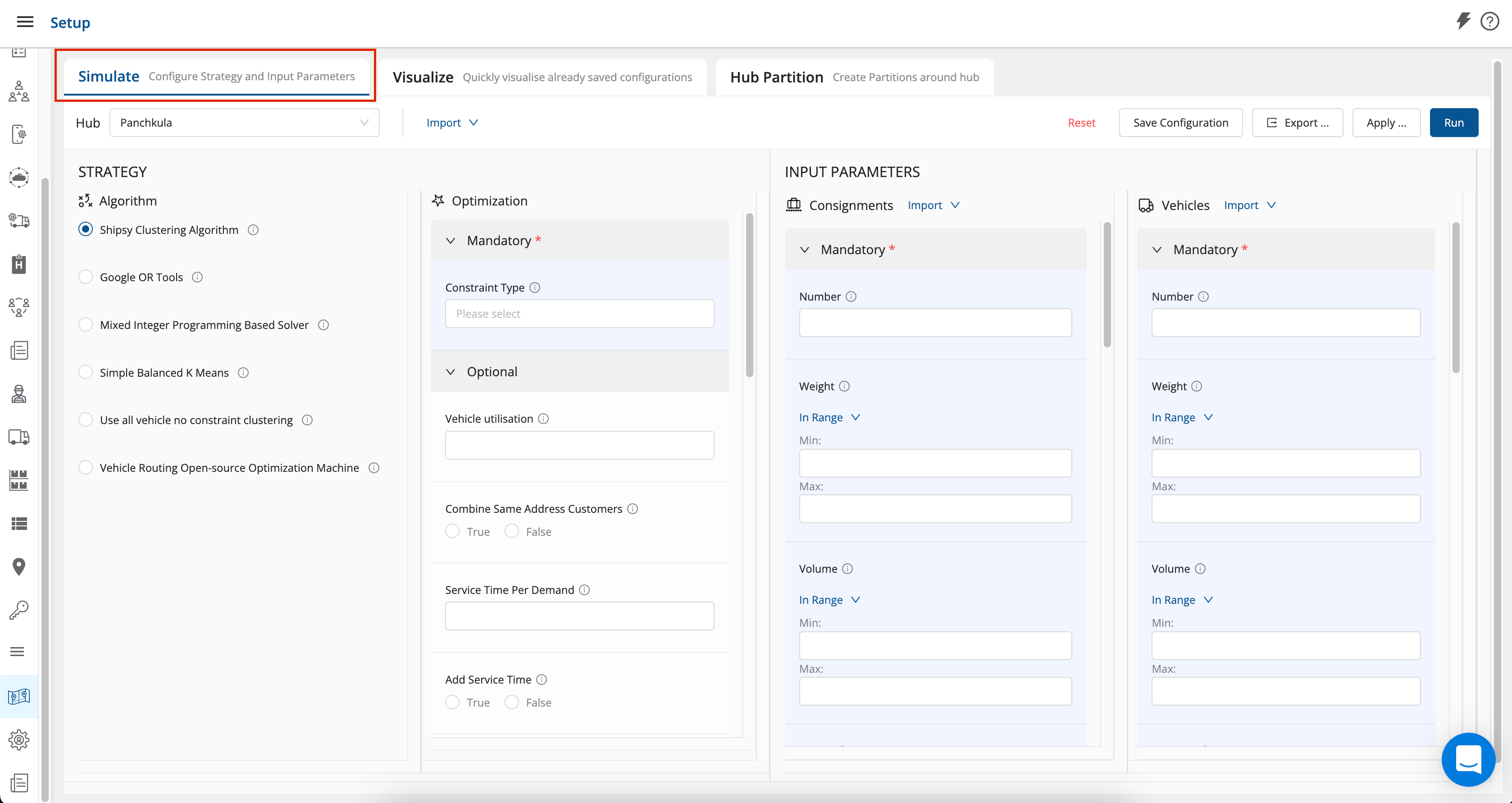- Hub: User can select the hub for which the simulation is to be done, or the strategy is to be set.