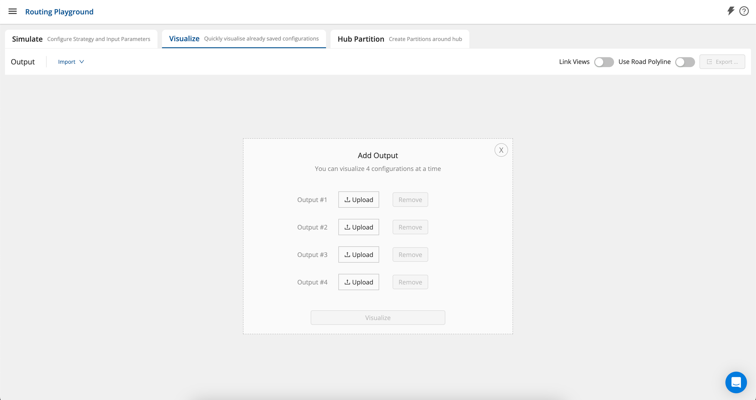 Using the Visualise Tab, users can upload up to 4 already configured strategies. To do so, the user must upload one or multiple outputs as per their requirements and click on the Visualise button.