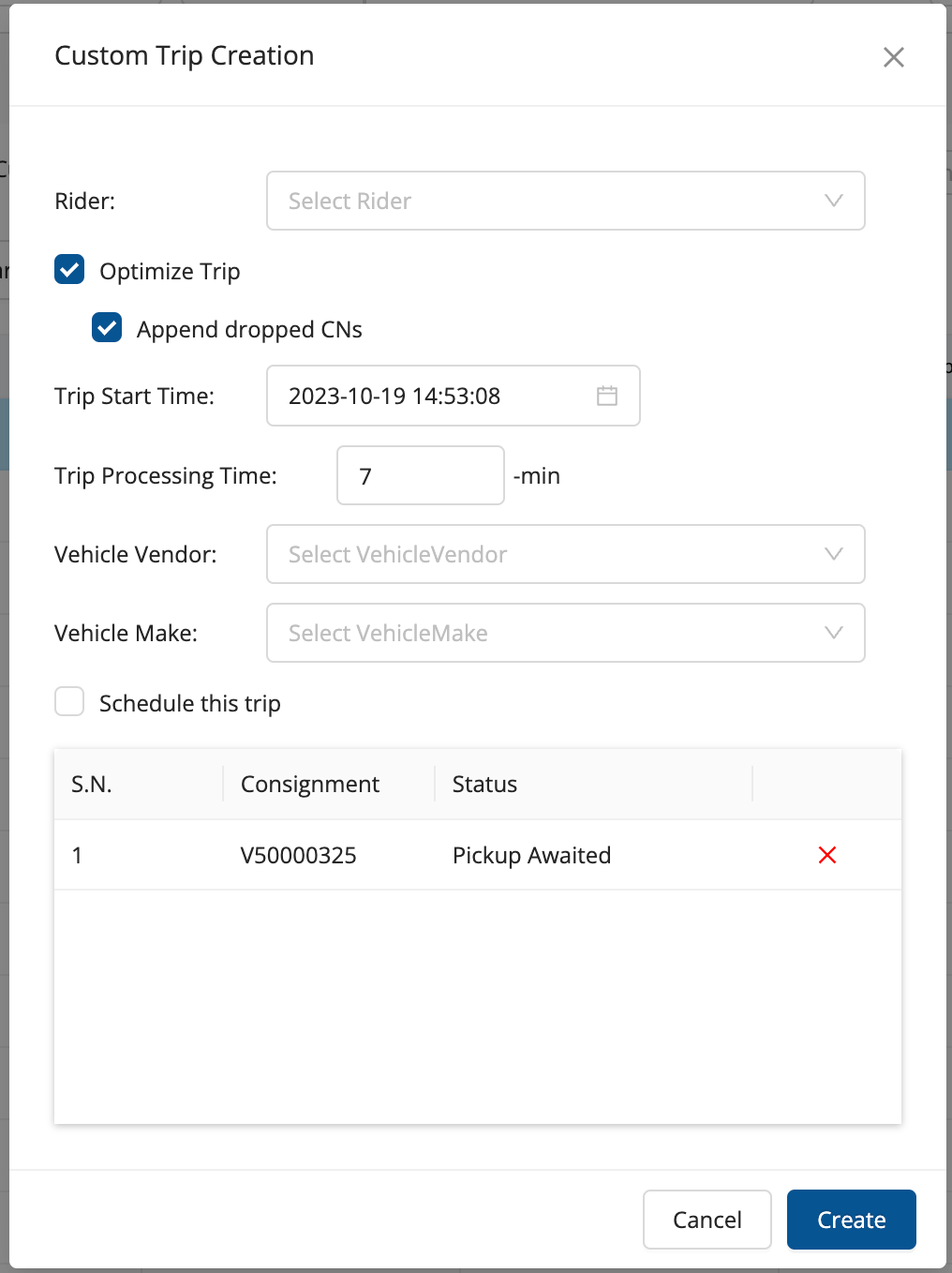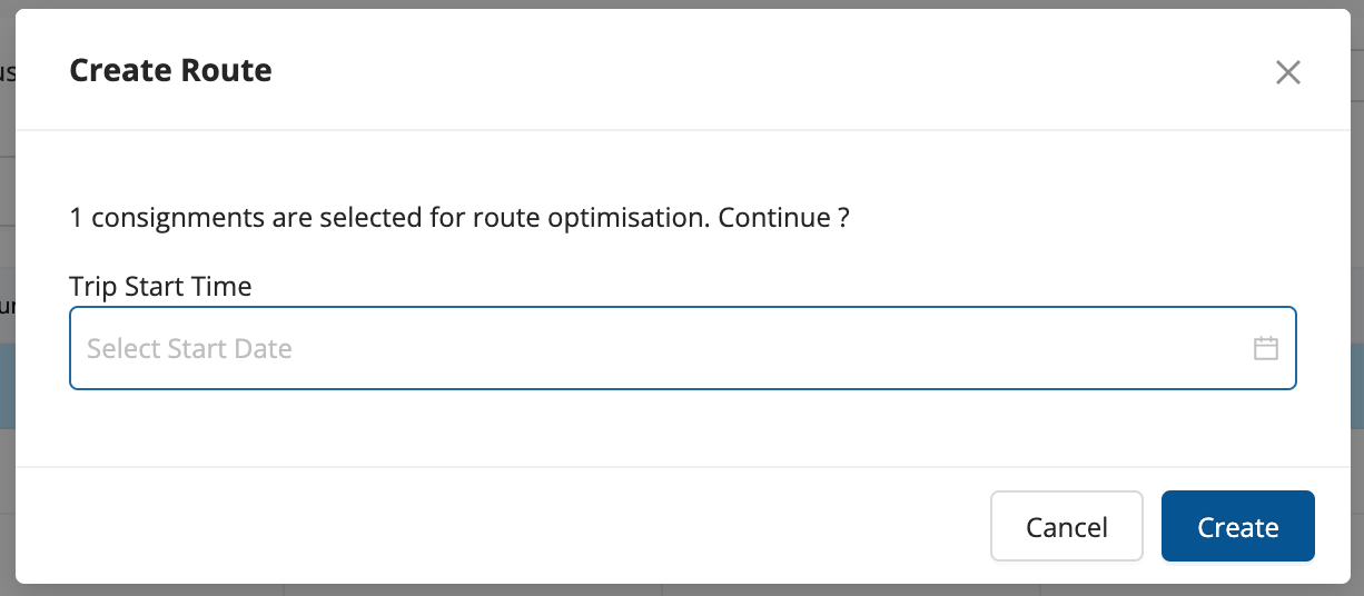 - Another way of creating a trip is by navigating to consignments > unplanned > create route and begin the trip creation process. Once the user selects whether they want to create a route for all/selected/filtered consignments, a prompt appears where the user will have to input the trip start time. Post that, the following things will take place in the background: