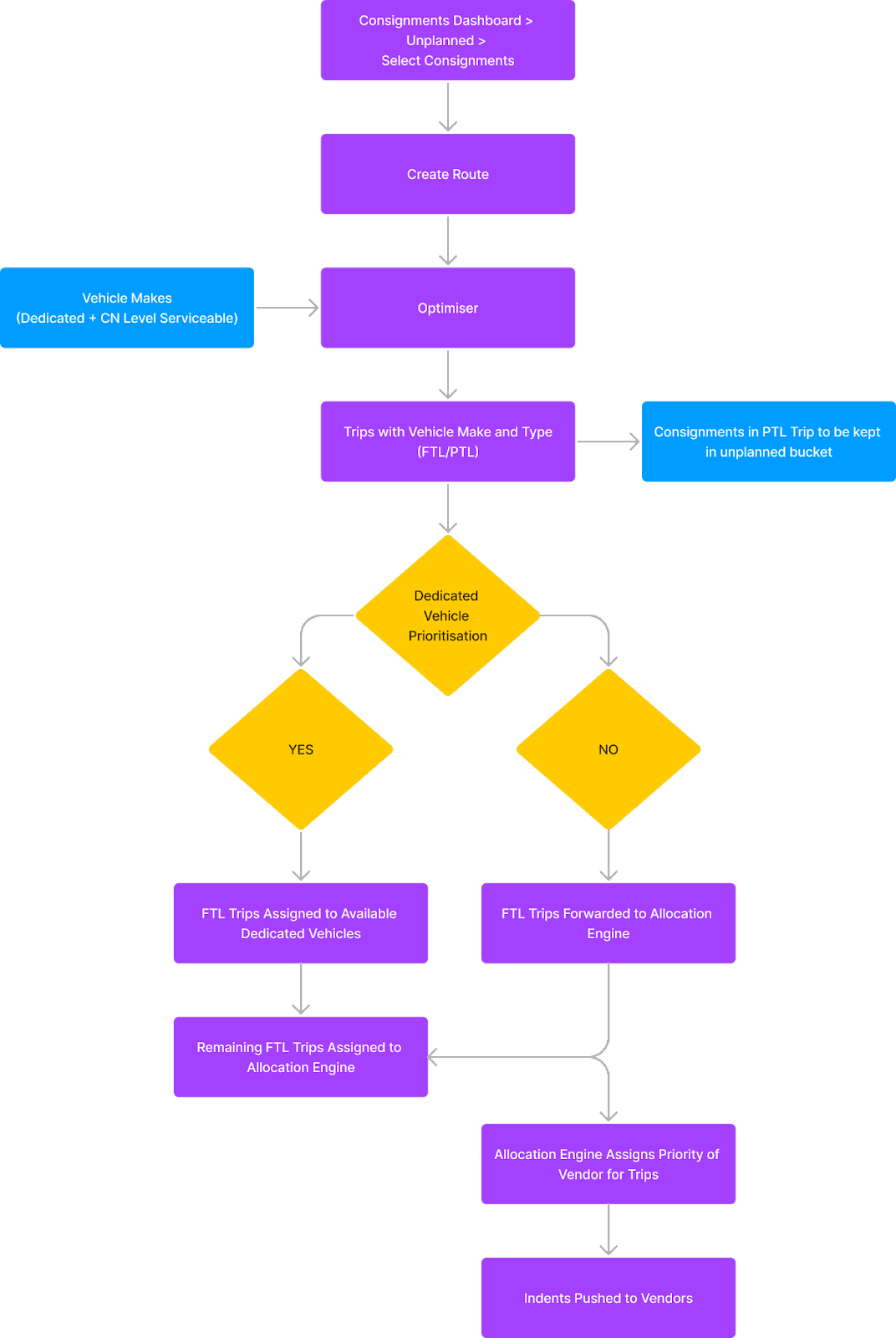In the allocation of Full Truck Load (FTL) trips, a crucial decision is made. Dedicated vehicles are accorded priority over pushing indents to vendors. This prioritisation is adjustable, granting the system the autonomy to determine whether dedicated vehicles should be assigned trips. If dedicated vehicles aren't prioritised, they won't be assigned any trips.