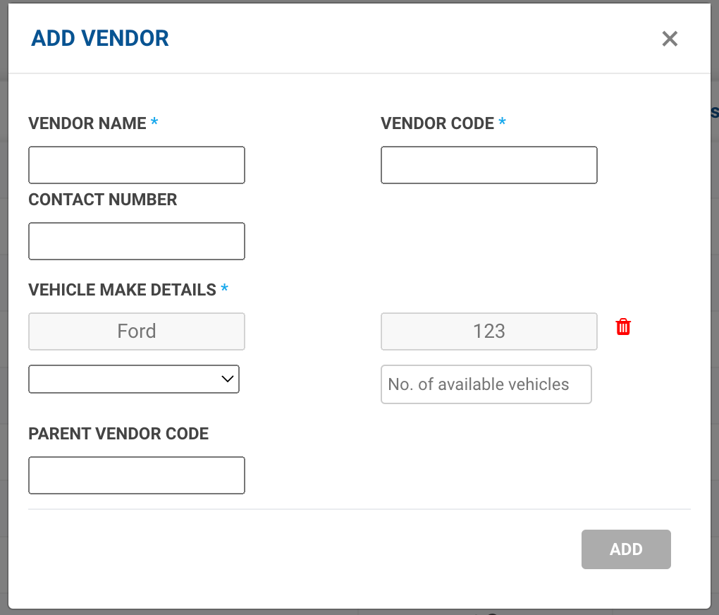 - Further, since a vendor will possibly have multiple vehicles from multiple vehicle makes, the user will have the option to add another vehicle make and define the number of vehicles present under the same by clicking on the + icon.