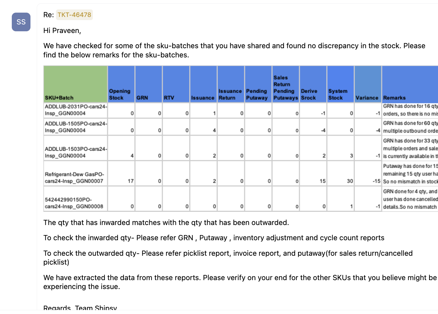 **>>**To address this, we must first verify the quantities that have been inwarded and outwarded. To assess the inwarded stock, we will need to consult the Goods Receipt Note (GRN), Putaway, and Cycle Count reports. These documents will provide us with the inwarded quantities for specific SKUs and batches.