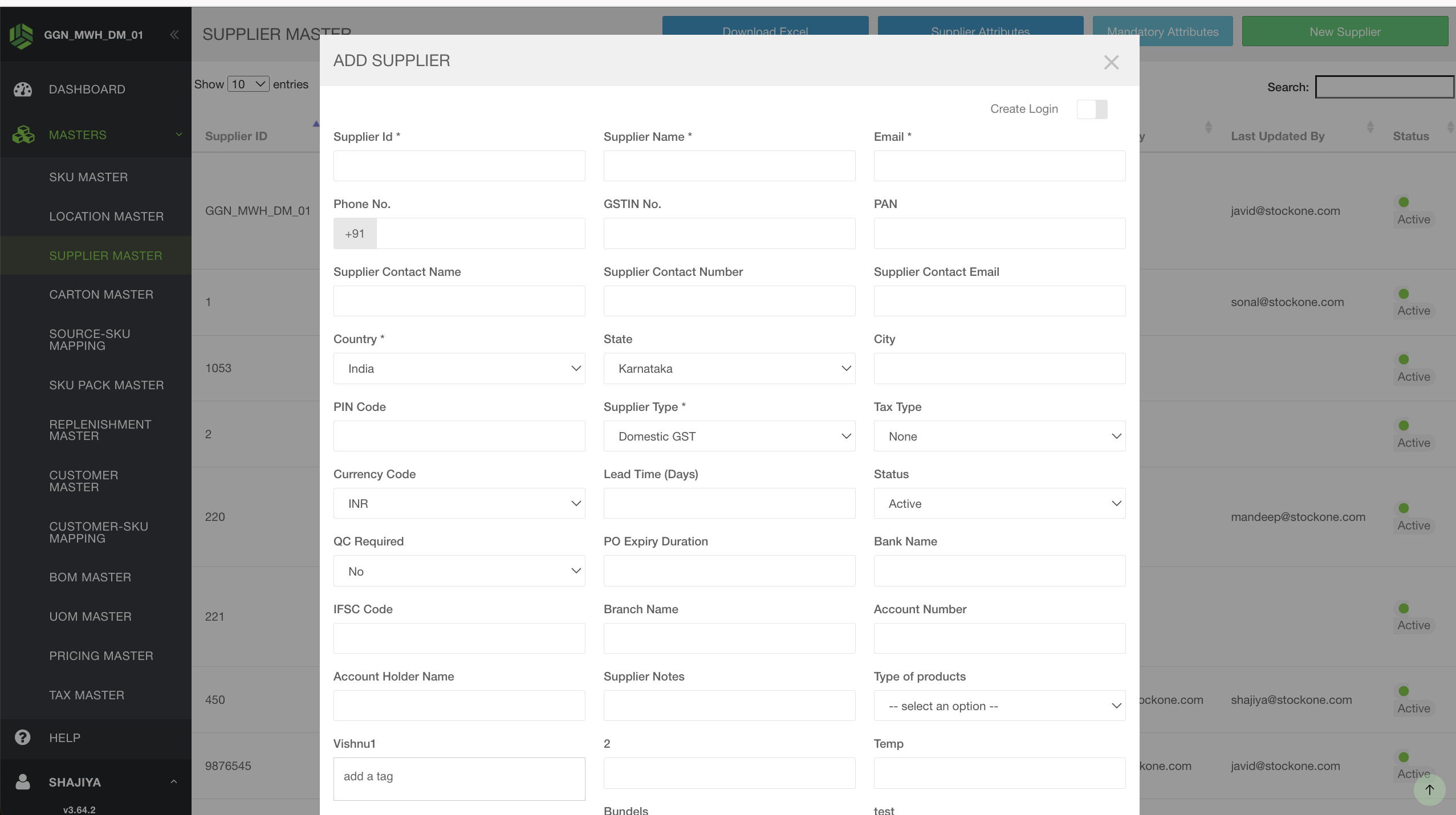 We need to navigate to StockOne's Masters. There, we can find the Supplier Master. By clicking on it, an option labeled 'New Supplier' will be visible at the top right. We need to click on this option, and a pop-up will open showing all the fields that need to be filled to create a supplier